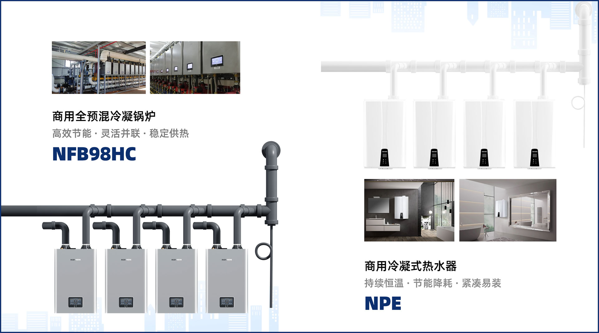 商用市场方面,NFB 98HC冷凝壁挂炉和NPE冷凝式热水器广泛应用于公共建筑与综合体。